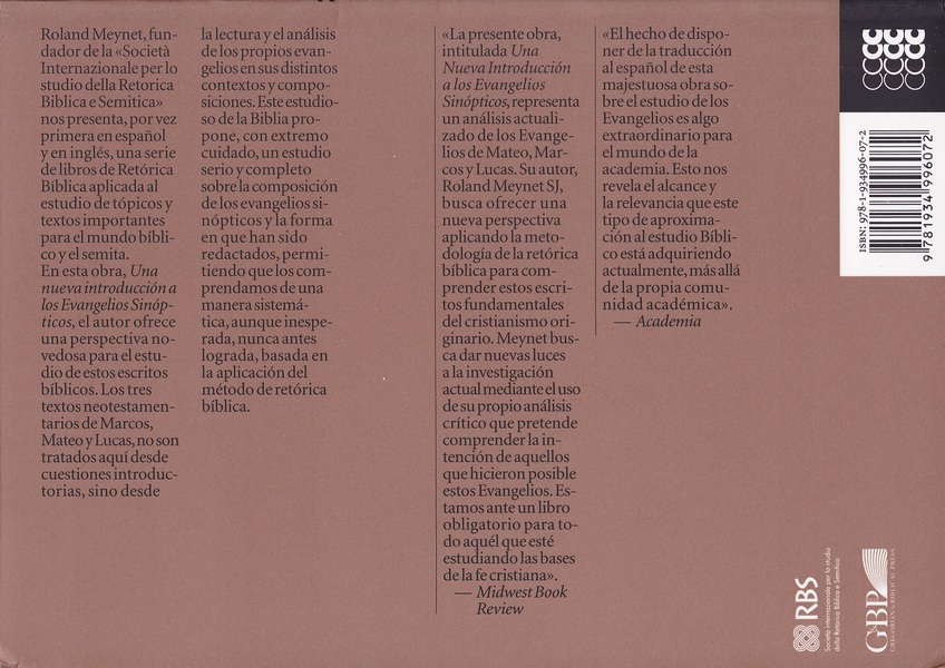 Roland Meynet, Una nueva introducción a los Evangelios Sinópticos, Rhetorica Semitica, Convivium Press – G&B Press, Miami, FL, 2012 (387 p.). Contenido Retro